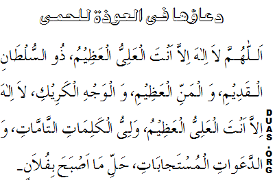 O Allah You are the most-High, the Mighty Possessor of; the ancient kingdom and great favors and a generous countenance there is no god but You the most-High, the Mighty Guardian of the complete words and the answered prayers remove what has happened to . . . (name of the person who is sick) |