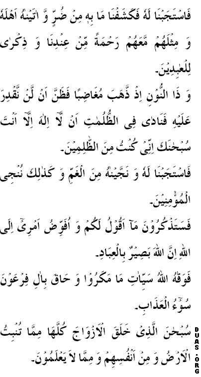 The holy Prophet said : Whosoever recites verses 156 and 157 of al Baqarah: verses 135 and 136 and 173 and 174 of Ali Imran, verses 83 and 84 and 87 and 88 of al Anbiya, verses 44 and 45 of al Munim shall always have sufficient means and if in prison soon shall be set free
