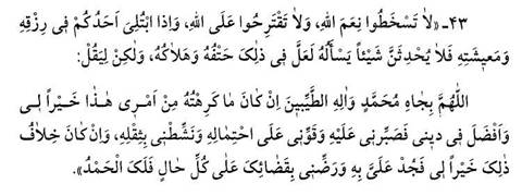 43.  “Do not abhor God’s blessings nor ask for any things without giving it a thought.  If affliction befalls sustenance and life of any one of you, do not ever ask for a change, since a change might lead to death or destruction.  You should rather say:  O God, by the position of Mohammad (SAW) and his household, if there is a blessing in what has befallen me, make me patient and give me not only the power of forbearance, but make me pleased with it too.  Yet if there is blessing in something else, give that something to me.  At any rate, make me pleased with Your Decree, for praise is due only to You.”