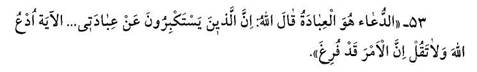 “Dua is better.  Have you not heard God saying:  Call upon Me; I will answer you.  I will make enter into the Hell with disgrace those who refrain from worshipping Me.