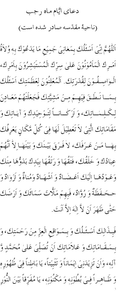 ۳۔ ماہ رجب کے دنوں کی دعائیں کہ جو آخری حجت سے صادر ہوئی ہیں
