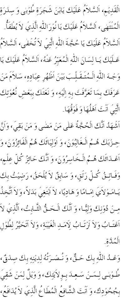 السلام علیک یا صاحب الزمان السلام علیک یا خلیفة الرحمن السلام علیک یا شریک القرآن السلام علیک کا قاطع البرھان السلام علیک یا امام الانس والجانّ السلام علیک و علی آبائک الطیبین و اجدادک الطاھرین المعصومین ورحمة اللّٰہ و برکاتہ۔