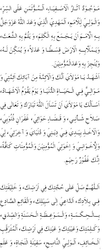 الْمَھْدِیِّ الْاِمامِ الْمُنْتَظَرِ الْمَرْضِیِّ وَابْنِ الْاَ ئِمَّۃِ الطَّاھِرِینَ الْوَصِیِّ ابْنِ الْاَوْصِیائِ